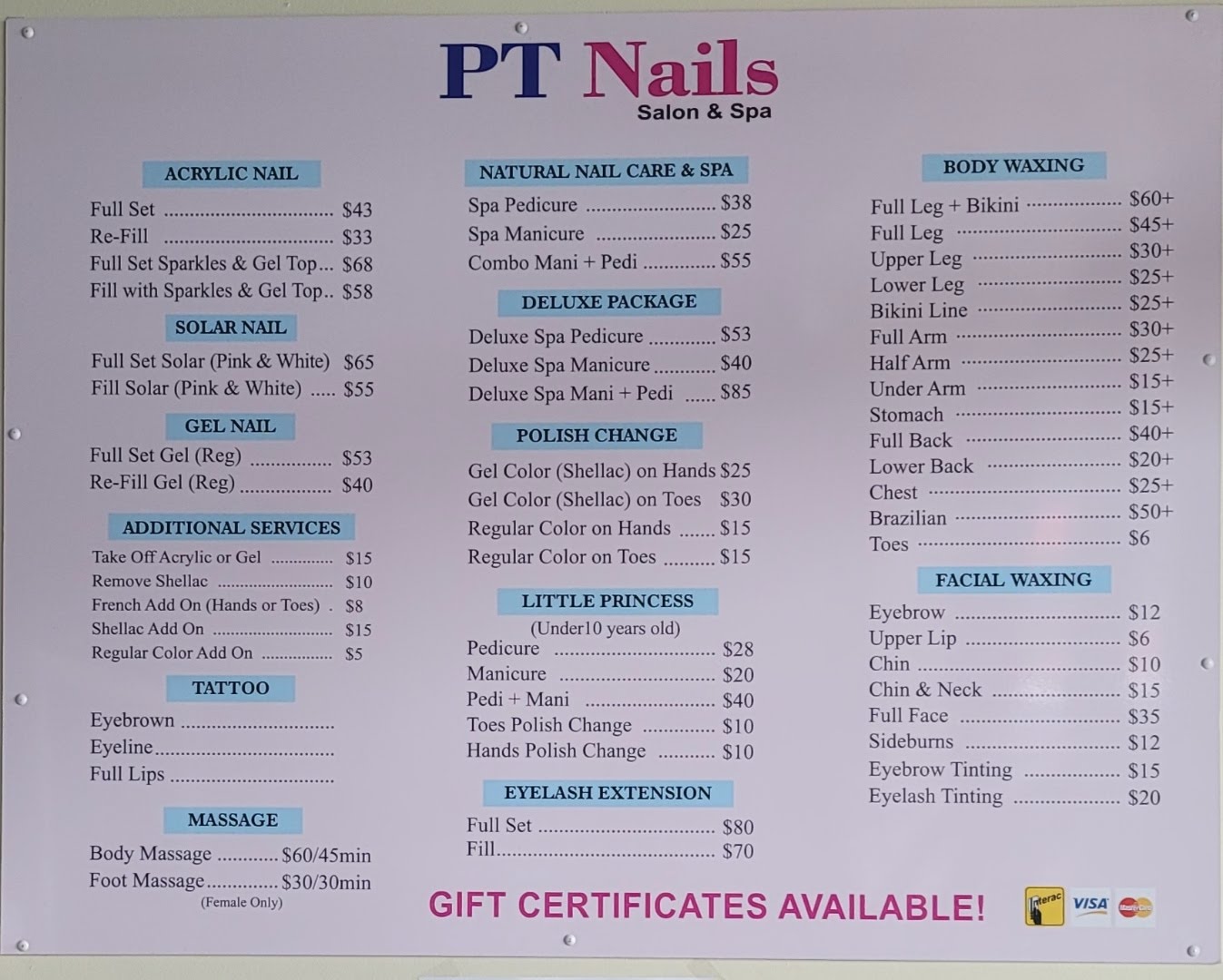 PT Nails a full service nail salon dedicated to consistently providing high Customer satisfaction by rendering excellent service, quality products, strict sanitation practices and furnishing a relaxing and comfortable atmosphere at an excellent value